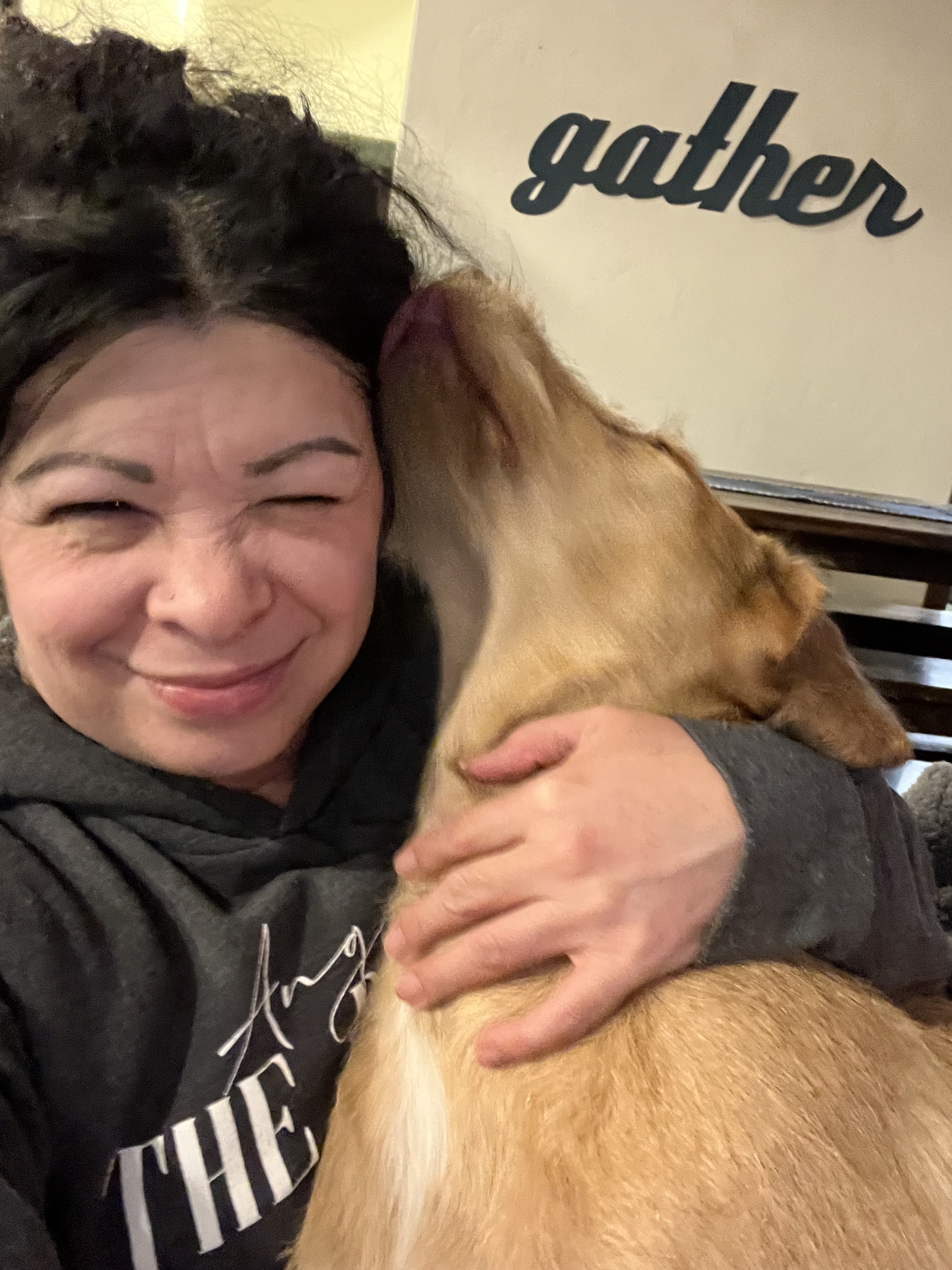 Hi! I’m Angela, pictured with cuddly Otis, our Labradoodle/Bulldog mix. Many of you know me as either Trae’s wife, Averee’s & Tyler’s mom, or the “chic” singer (Miss Angel) in Angel & the Badmen.. That’s actually much of who I am. I’m also a songwriter and I love to create things, whether it be a painting (that I’m just learning how to do), a beautiful room, a restored piece of furniture, a garden or a new song.