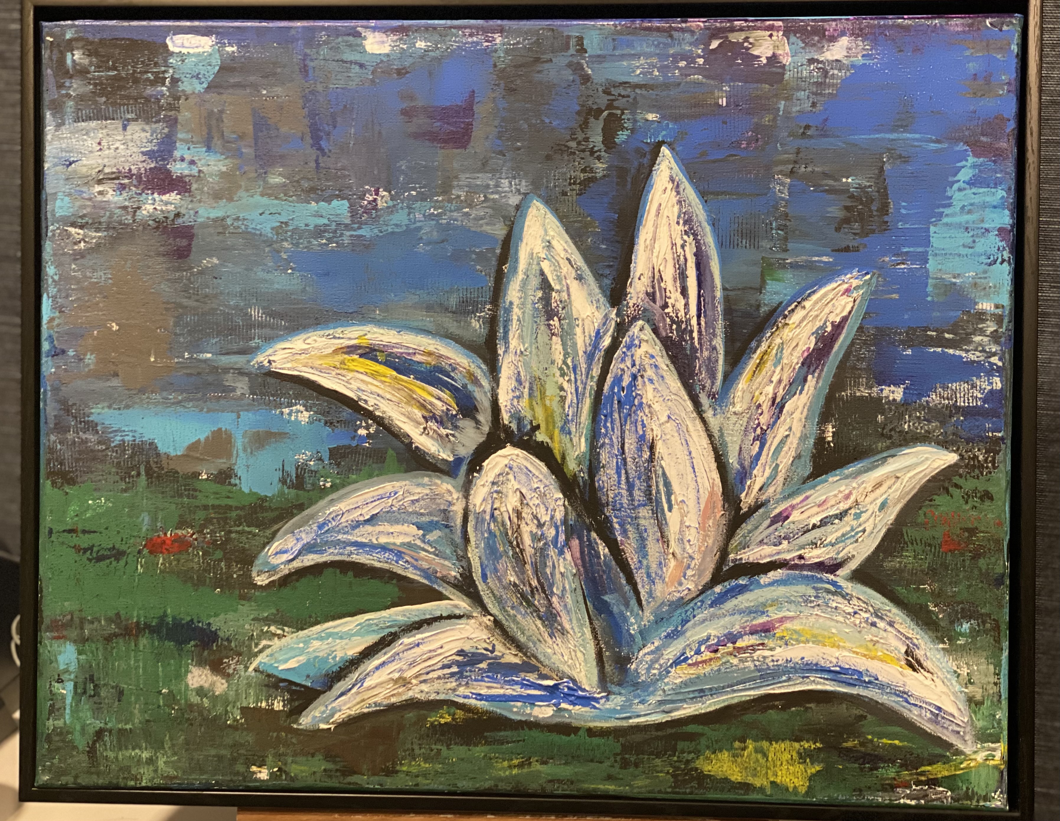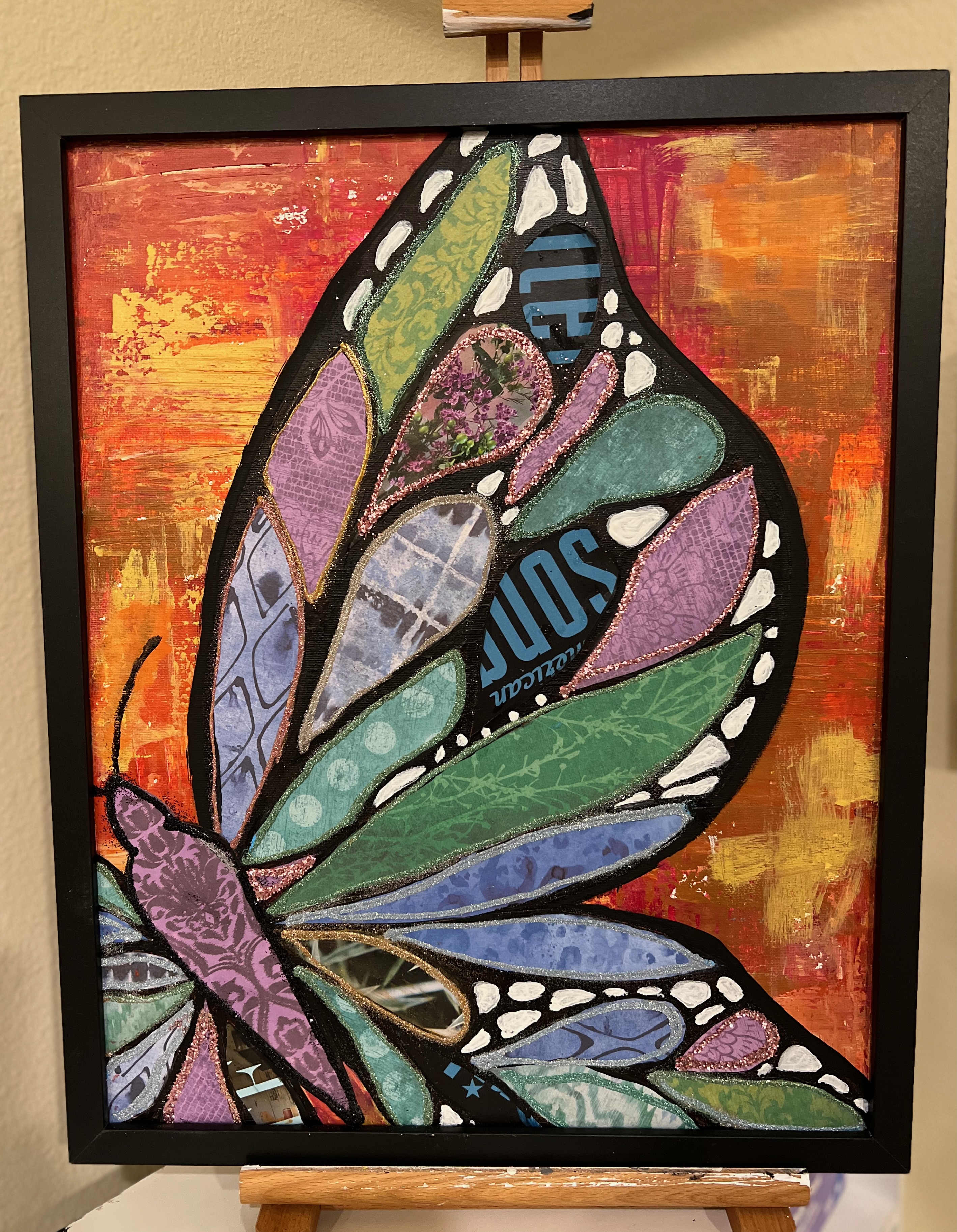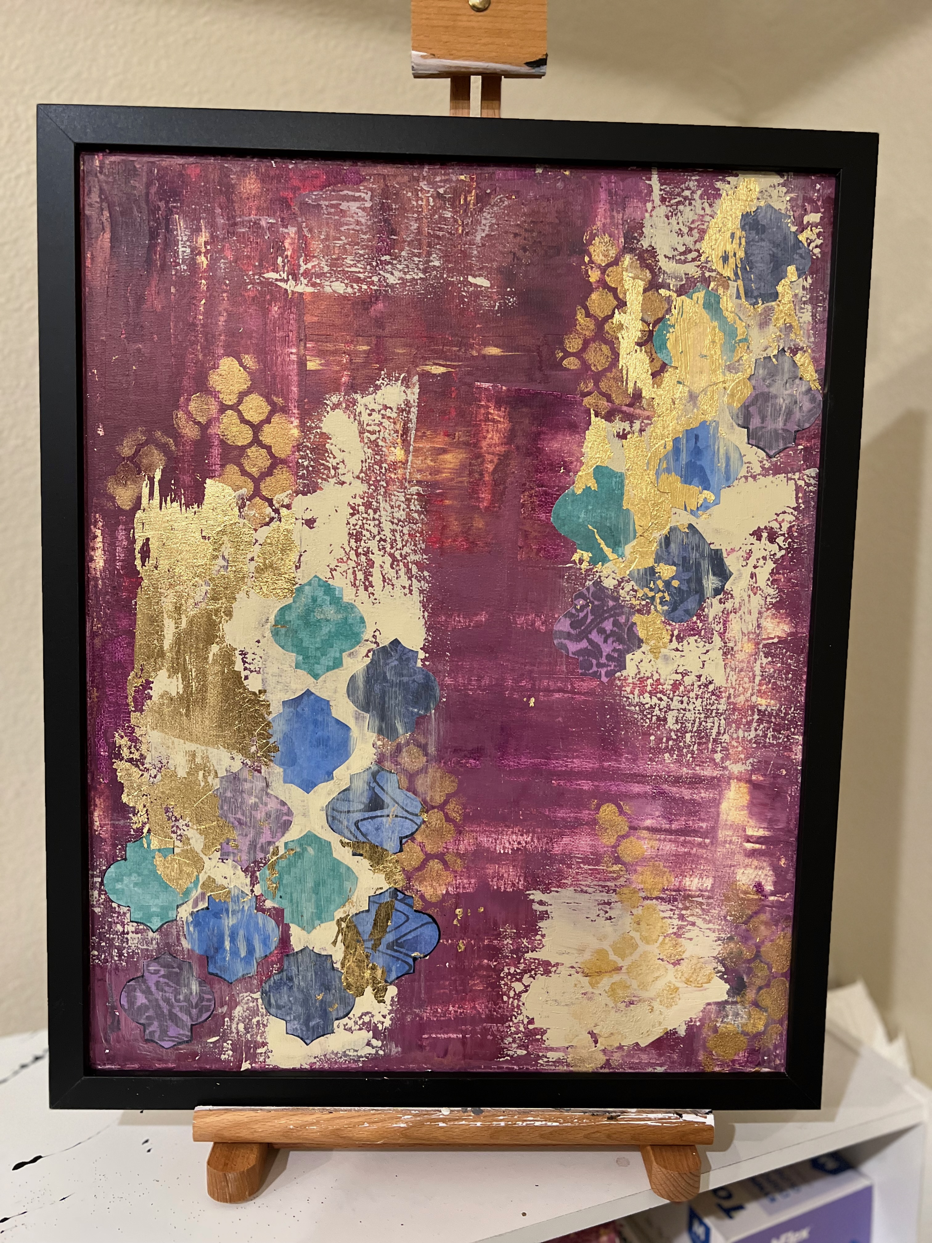 Studio- I took over the upstairs living room! the music sideplaying with papers including magazines, acrylics, and glitter! playing with papers, acrylics and gold leafing“Sunflower” Acrylic and modeling paste on canvas “Sunflower” Acrylic and modeling paste on canvas“Blue Agave” Acrylic and modeling paste on canvas “Marley”Acrylic on canvas “Brooks“A crylic and modeling paste on canvasVinyl lettering on old window Outdoor side table made from a trough Tea cart donation for MCA auctionCabinet refinish for a client for a little girls room Piano restoration for Midland Bible Church Oil & Cold wax on panel board “Night life” acrylic on canvas“Head to Head” acrylic and various texture mediums on canvas