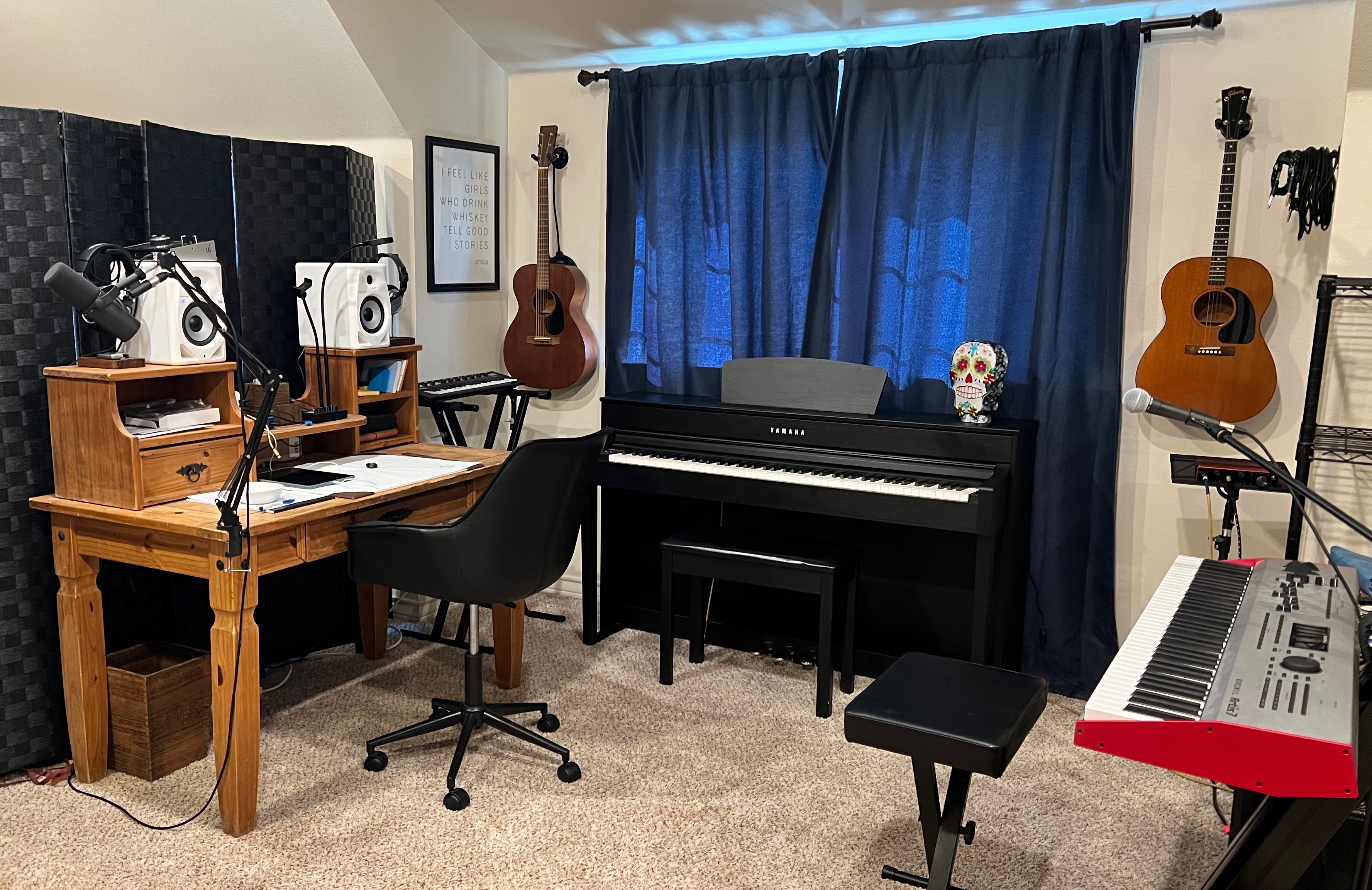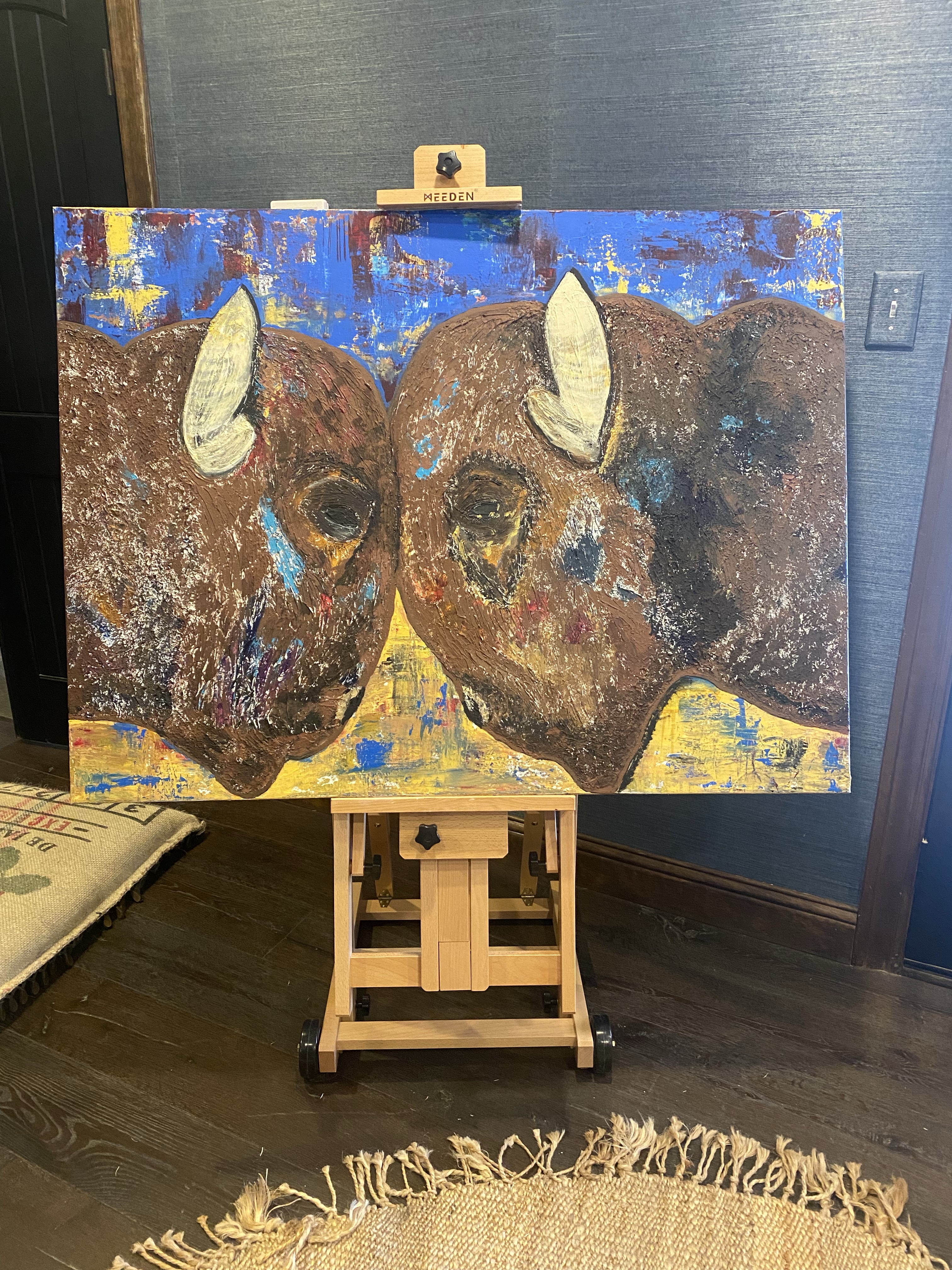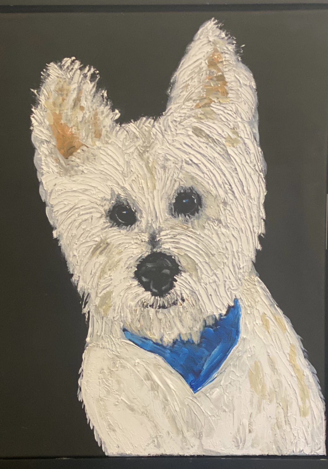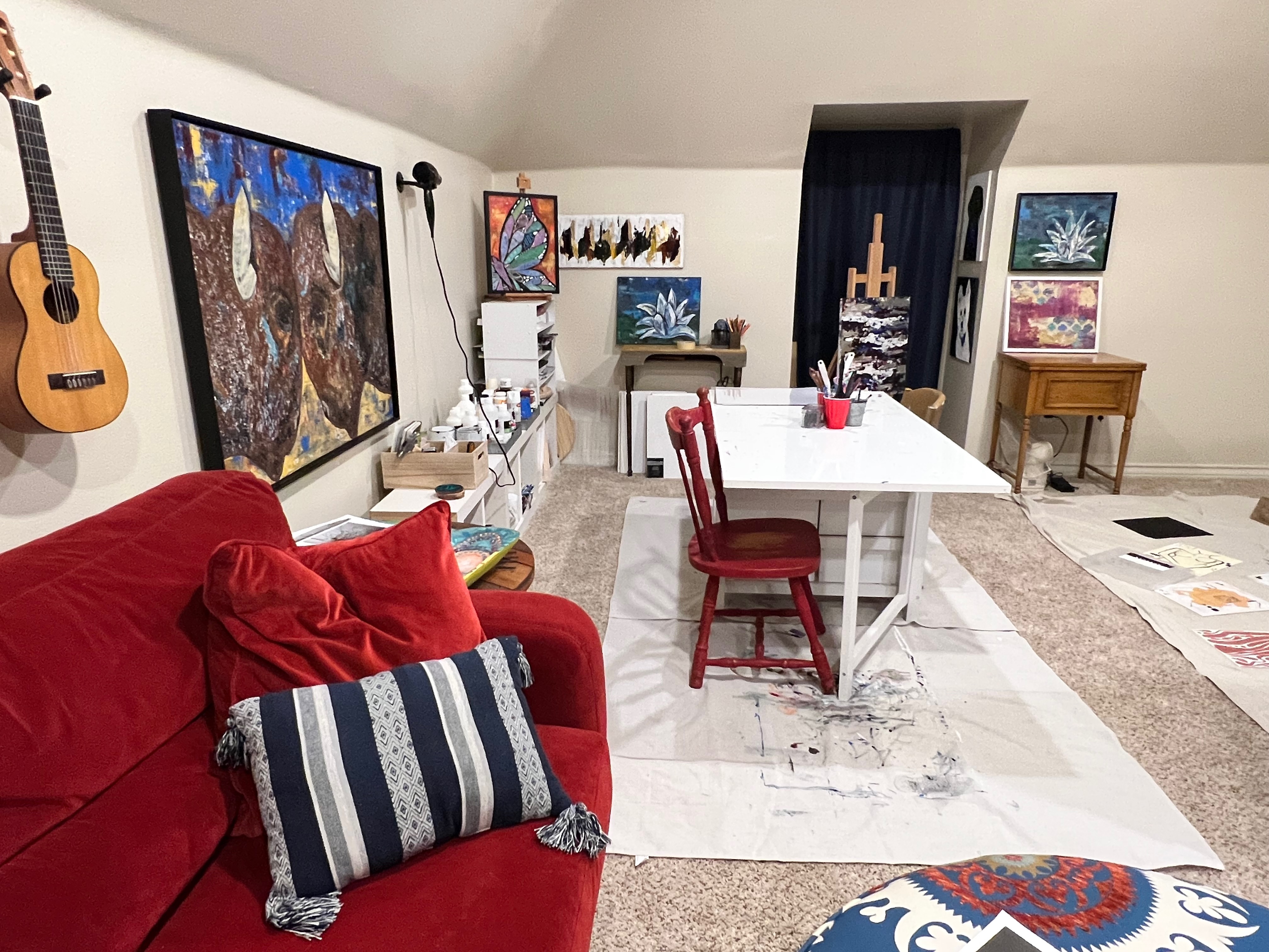 Studio- I took over the upstairs living room! the music sideplaying with papers including magazines, acrylics, and glitter! playing with papers, acrylics and gold leafing“Sunflower” Acrylic and modeling paste on canvas “Sunflower” Acrylic and modeling paste on canvas“Blue Agave” Acrylic and modeling paste on canvas “Marley”Acrylic on canvas “Brooks“A crylic and modeling paste on canvasVinyl lettering on old window Outdoor side table made from a trough Tea cart donation for MCA auctionCabinet refinish for a client for a little girls room Piano restoration for Midland Bible Church Oil & Cold wax on panel board “Night life” acrylic on canvas“Head to Head” acrylic and various texture mediums on canvas